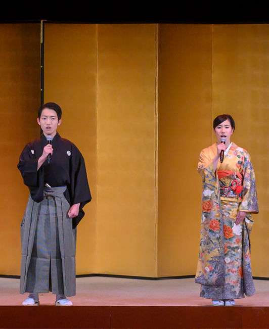 吟詠は舞台芸術であると同時に、礼節に重きをおく日本の伝統芸道ですので、舞台では芸の始まりと終わりに演者が観客に対して礼の心を表すことが決まりとなっています。